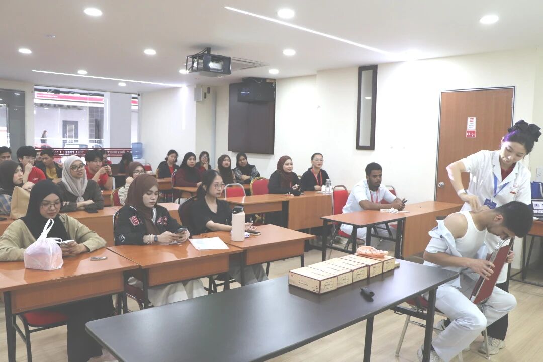 研学团师生还走进“浙江省丝路学院——中马越医学堂”,作为中医药文化的传播者,中医学专业于彦威老师开展中马越医学堂第12期讲座——《颈椎亚健康中医适宜技术精讲》,手把手教学生刮痧、耳穴压豆等中医适宜技术,让中马师生近距离感受中华优秀传统文化的独特魅力。