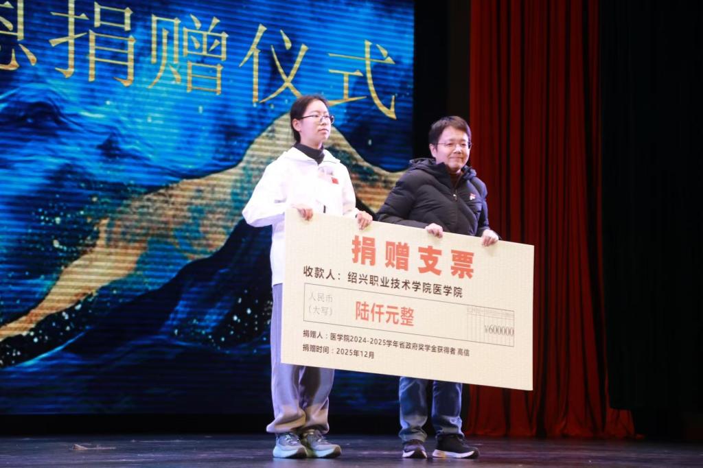在不久前举行的医学院2025级迎新晚会上,学院专门为高信举行了捐赠仪式。高信在现场将象征善款的支票郑重递交给医学院党总支书记、副院长金冰,她说:“作为一名医学生,医学不仅是技术,更是一种关于生命尊严与信念的抉择。”12月14日,学院正式公示了资助名单,6名同学将获得帮助。