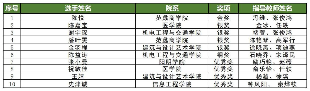 12月18日到19日,第三届全国大学生职业规划大赛(浙江赛区)暨第十六届浙江省大学生职业规划大赛在宁波大学落幕。经过激烈角逐,我校参赛选手凭借出色表现,取得优秀成绩,共获金奖1项、银奖4项、铜奖1项、优秀奖4项。