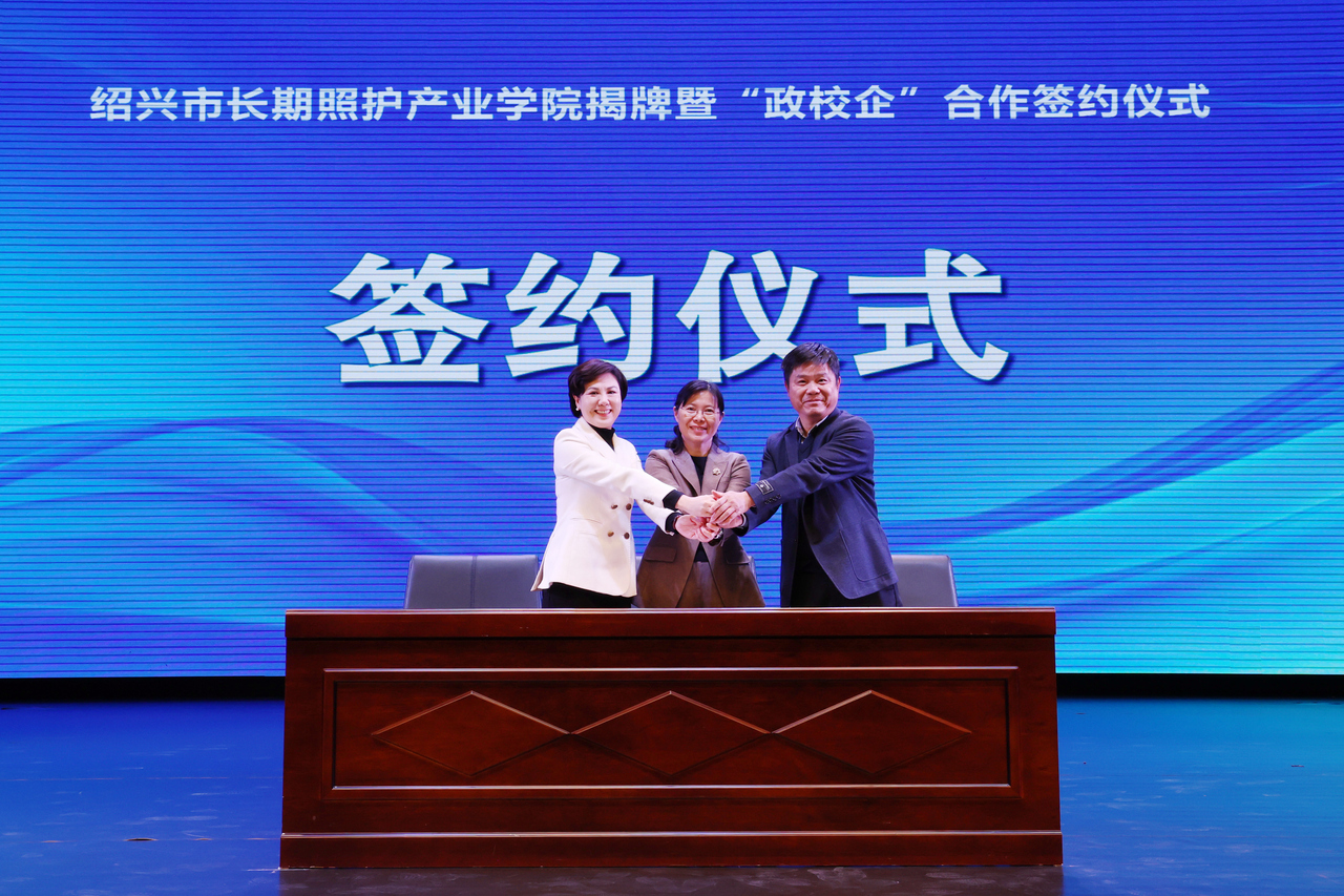 仪式上,三方代表共同签署合作协议,并为“绍兴市长期照护产业学院”及“绍兴市长期护理保险运营服务中心”揭牌。